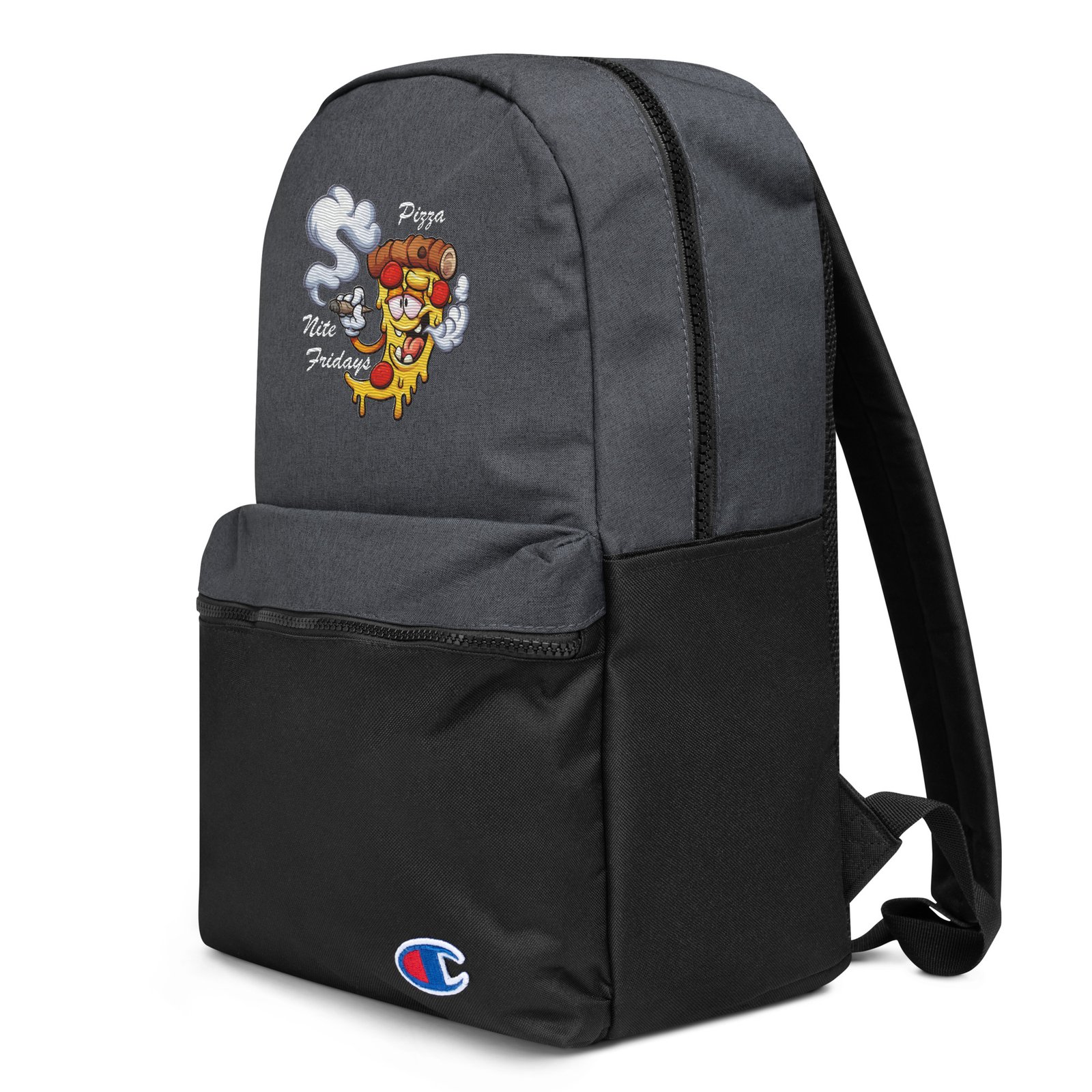 • Padded ergonomic polyester bag straps with plastic strap regulators and Champion brand label on the left strap